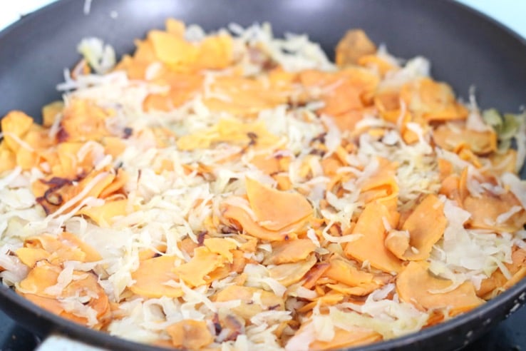 Maar wij niet alleen zijn fan van zoete aardappeltortilla’s. Zo kwam ik laatst een variant tegen met zuurkool, in het werkelijk prachtig vormgegeven ‘Feel good food’ kookboek van Pauline Weuring (Uitpaulineskeuken.nl). En dat leek me zo’n lekkere combi, het zoete van de aardappel en het zure van de zuurkool. Dat ik ‘m heb geprobeerd. En yes, het was heerlijk! Dus bij deze deel ik hem met jullie. En uiteraard gaan alle credits naar topper Pauline :-). 1 tortilla is trouwens voor 2 personen, komt -ie.