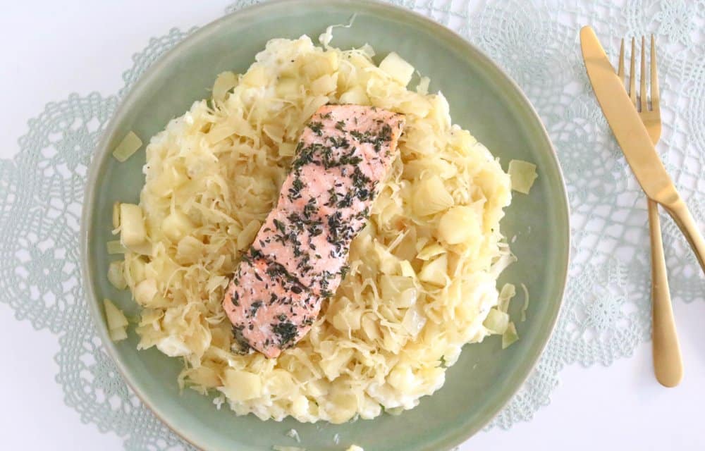 Elise was in eerste instantie een beetje vertwijfeld; is dat echt lekker? Challenge accepted Elise! De zuurkool hebben we samen met wat appel gestoofd in witte wijn. We serveren hem op een bedje van romige aardappelpuree en maken het geheel af met een flinke moot zalm uit de oven. Resultaat; ook Elise was overtuigd. Dus, laat je verassen en lees snel verder voor het recept.