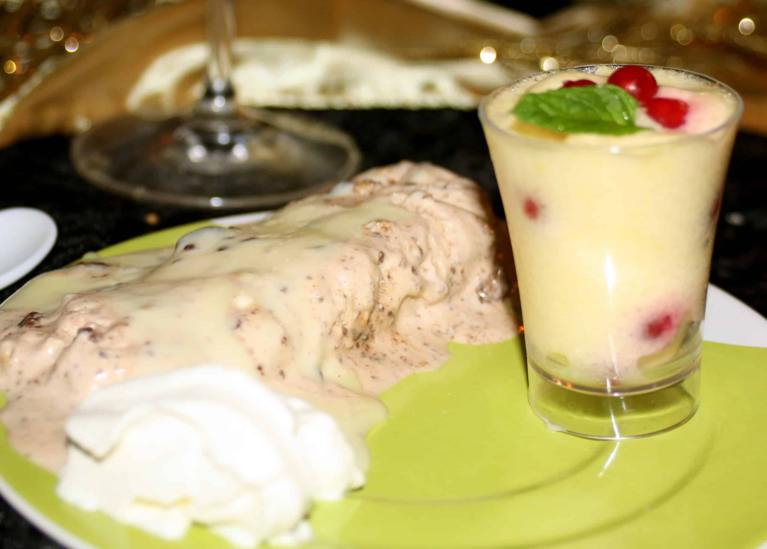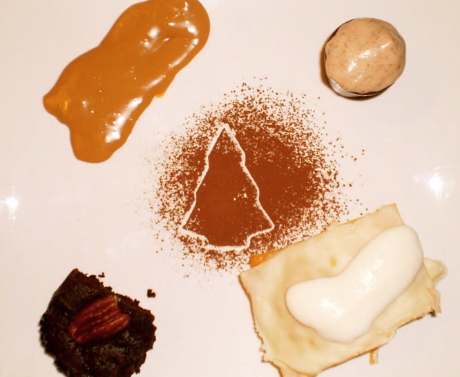 Een witte chocolade tompouce met ijs, een warme chocolade/pecan brownie, bananen-straciatellaroom in een chocoladebekertje, warme karamelsaus en een cacao-kerstboom.