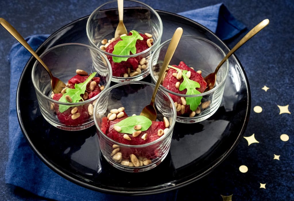 Klassieke carpaccio, maar deze keer niet op een bord. In een glaasje en makkelijk op te eten met een lepel. Geniet van een heerlijke dressing van balsamicoazijn en mayonaise.