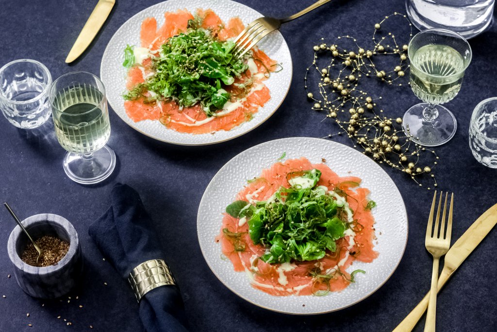 Deze zalmcarpaccio met een Oosterse twist is een ideaal voorgerecht wanneer je tijdens de drukke feestdagen snel iets moois op tafel wil toveren. Binnen 10 minuten ben je al klaar en dat met maar 5 ingrediënten!