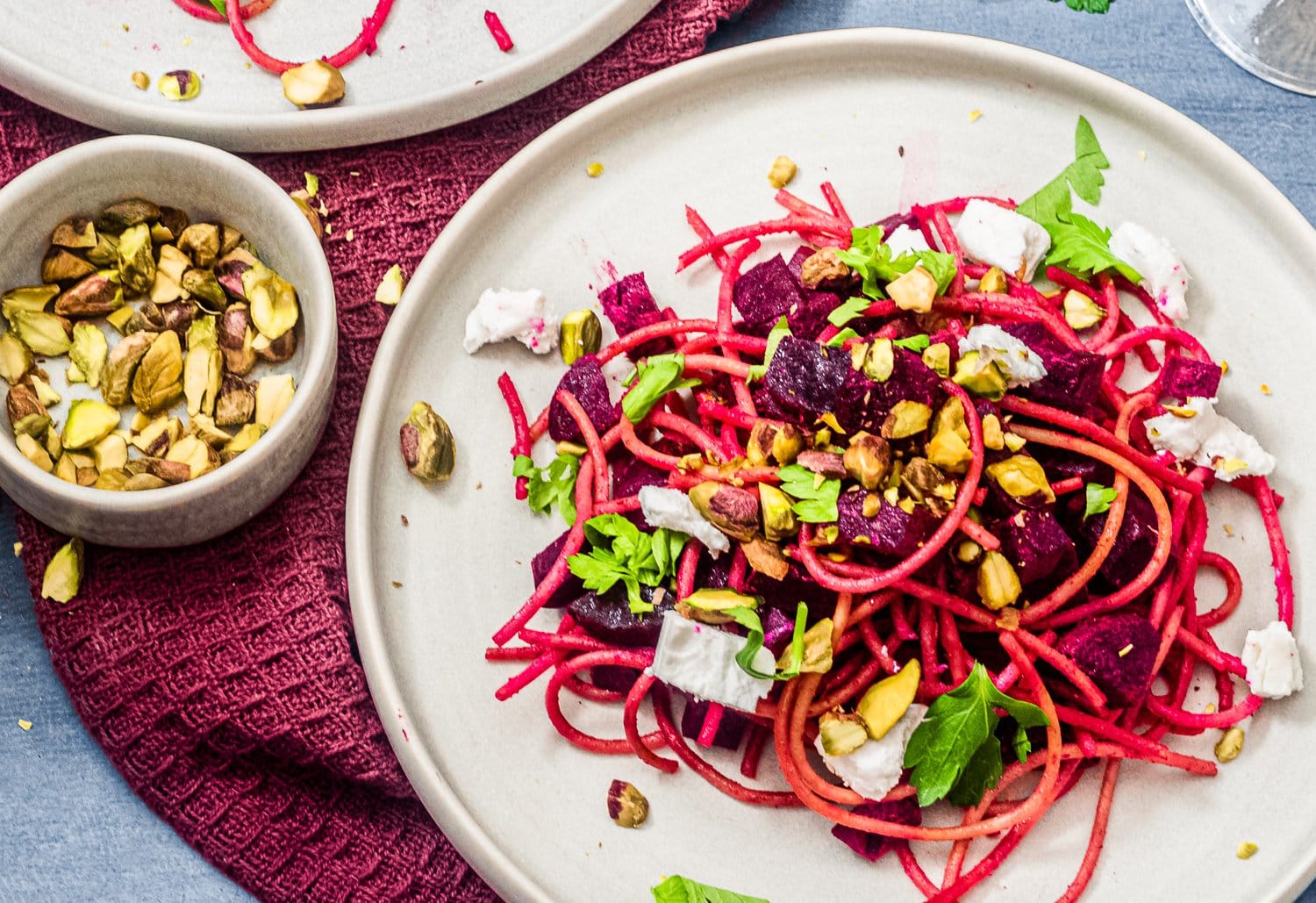 Wat een plaatje hè? Deze kleurrijke spaghetti maak je binnen een kwartier. Wat je er voor nodig hebt? Pistachenoten, rode biet, geitenkaas en bladpeterselie.