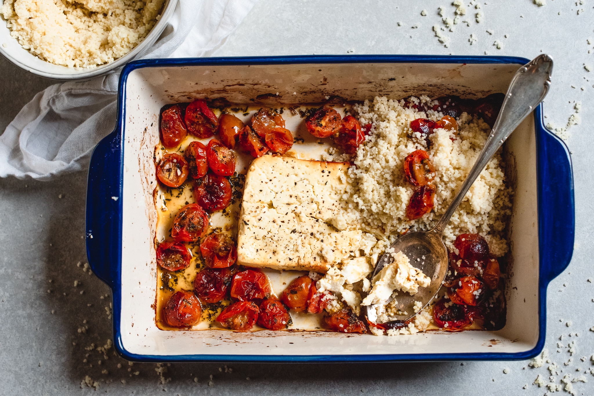 Wat is er nog lekkerder dan feta? Feta uit de oven! Zo krijgt de kaas nóg meer smaak en dat is heerlijk in combi met de zoete cherrytomaatjes, Italiaanse kruiden en couscous.
